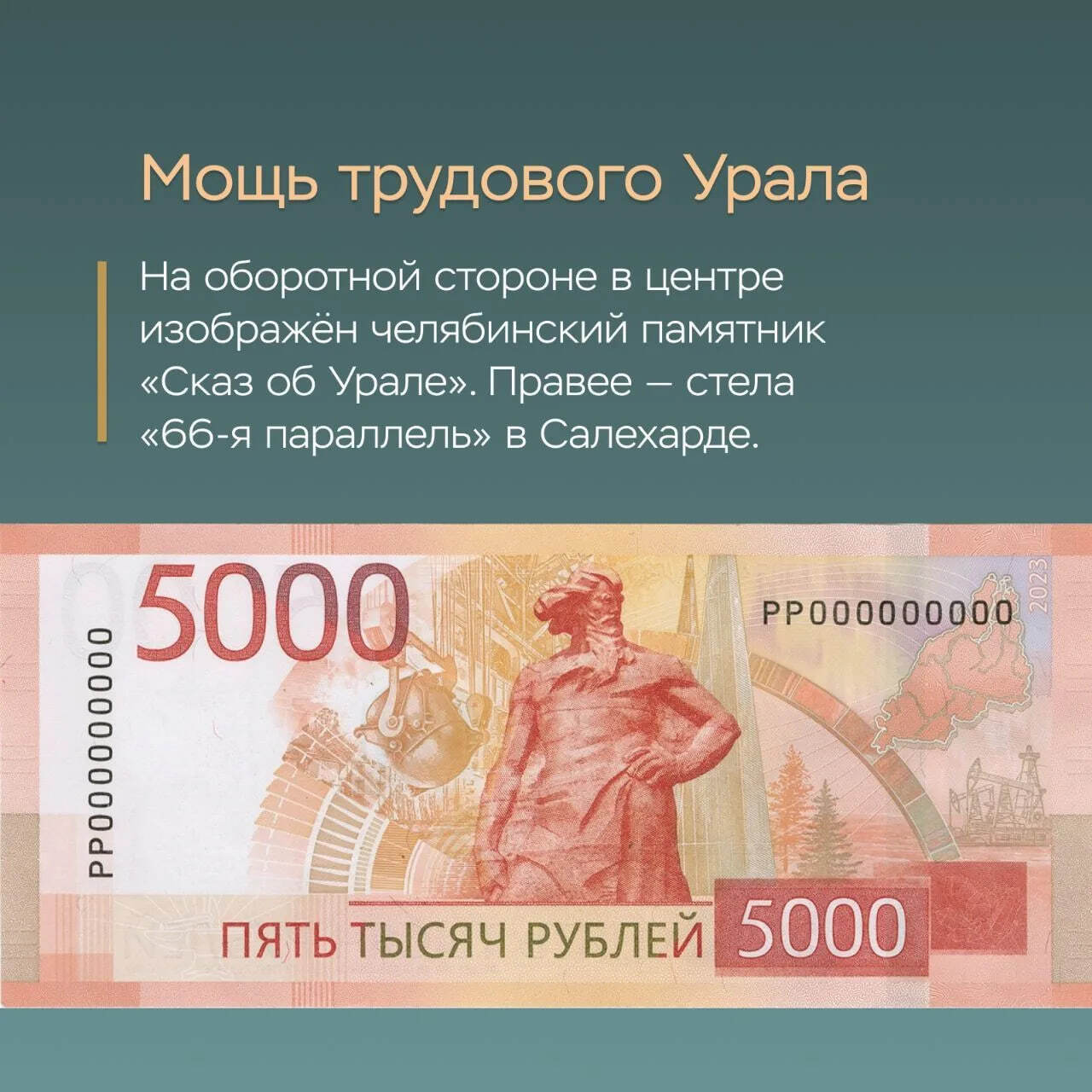 Модернизированная банкнота номиналом 5000 рублей выпущена в 2023 году. Все обновленные банкноты посвящены федеральным округам и их столицам. На пятитысячной представлен Уральский федеральный округ и его столица — Екатеринбург.