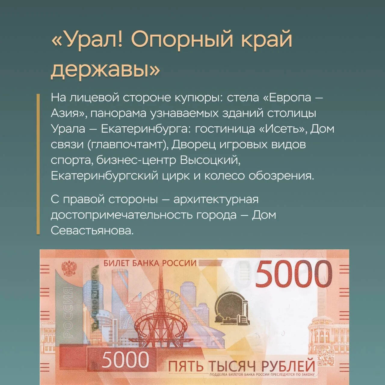 Интересные факты о пятитысячной банкноте Банка России — в карточках.