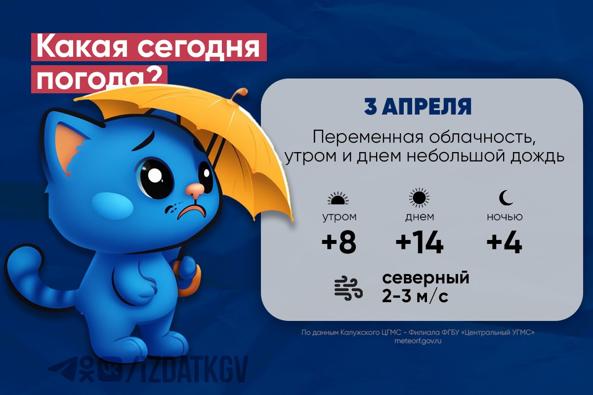 В пятницу, 3 апреля, в Калужской области ожидается солнечная погода.Утром температура воздуха будет +8 градусов. Днём прогреется до +14.Ветер западный слабый 3 метра в секунду.Атмосферное давление 738 миллиметров...