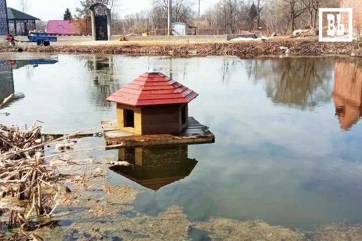 Жители думиничского села Брынь построили и спустили на воду плавучий домик для уток