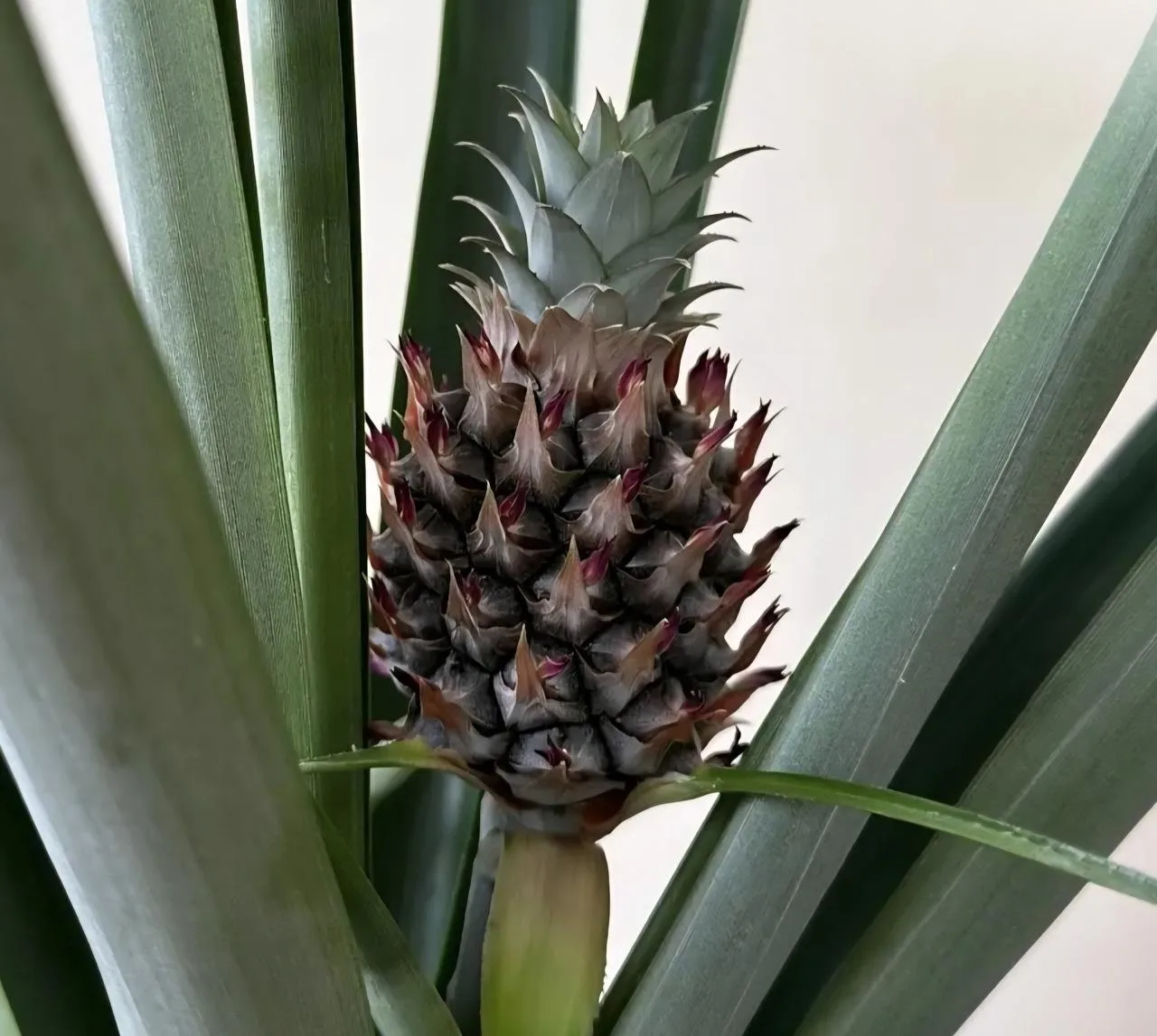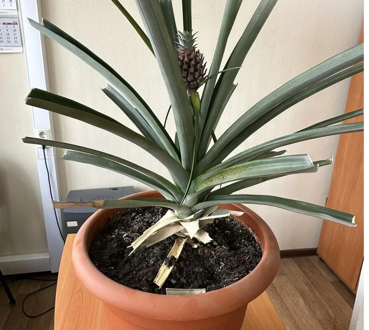 8 лет назад сотрудники министерства посадили в горшок обычную верхушку магазинного ананаса. Растение принялось, выросло в шикарный куст, но 8 лет не плодоносило. И вот, спустя столько времени, на подоконнике рабочего кабинета созрел маленький ананас.