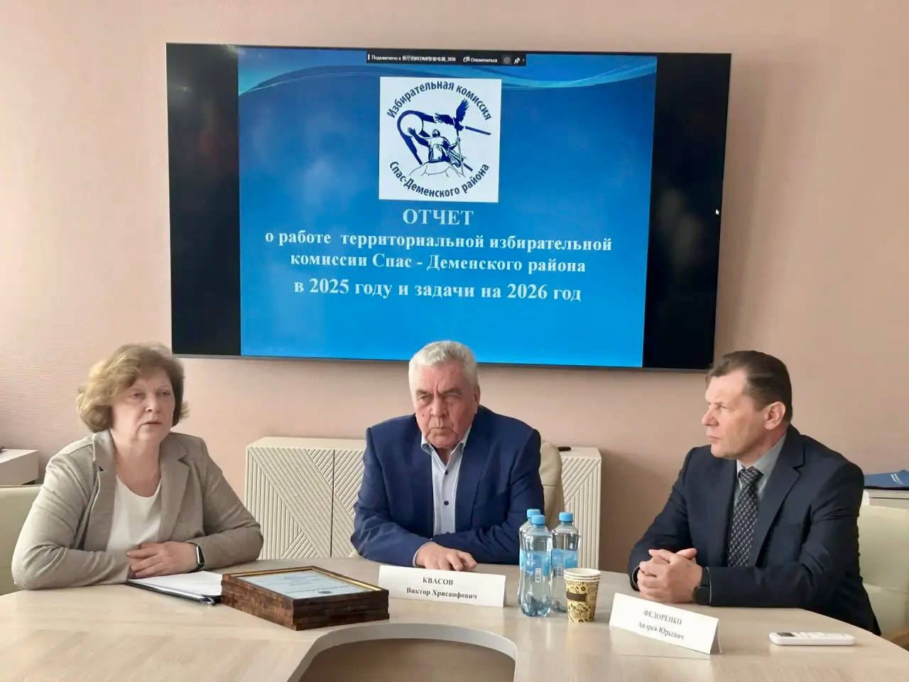 Сегодня состоялось мероприятие по подведению итогов работы территориальной избирательной комиссии Спас-Деменского района за 2025 год, на котором присутствовали: заместитель председателя Избирательной комиссии Калужской области Андрей Федоренко, советник Губернатора Калужской области Виктор Квасов, члены территориальной и участковых избирательных комиссий, представители СМИ.