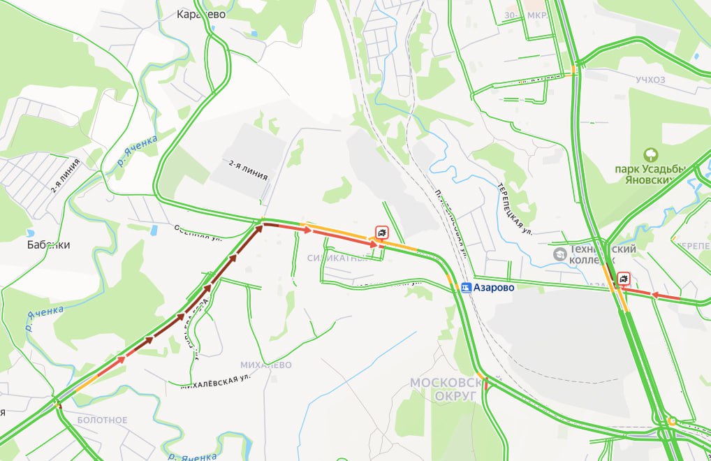 Также утром из-за аварии затруднено движение на перекрестке улиц Азаровской и Московской.