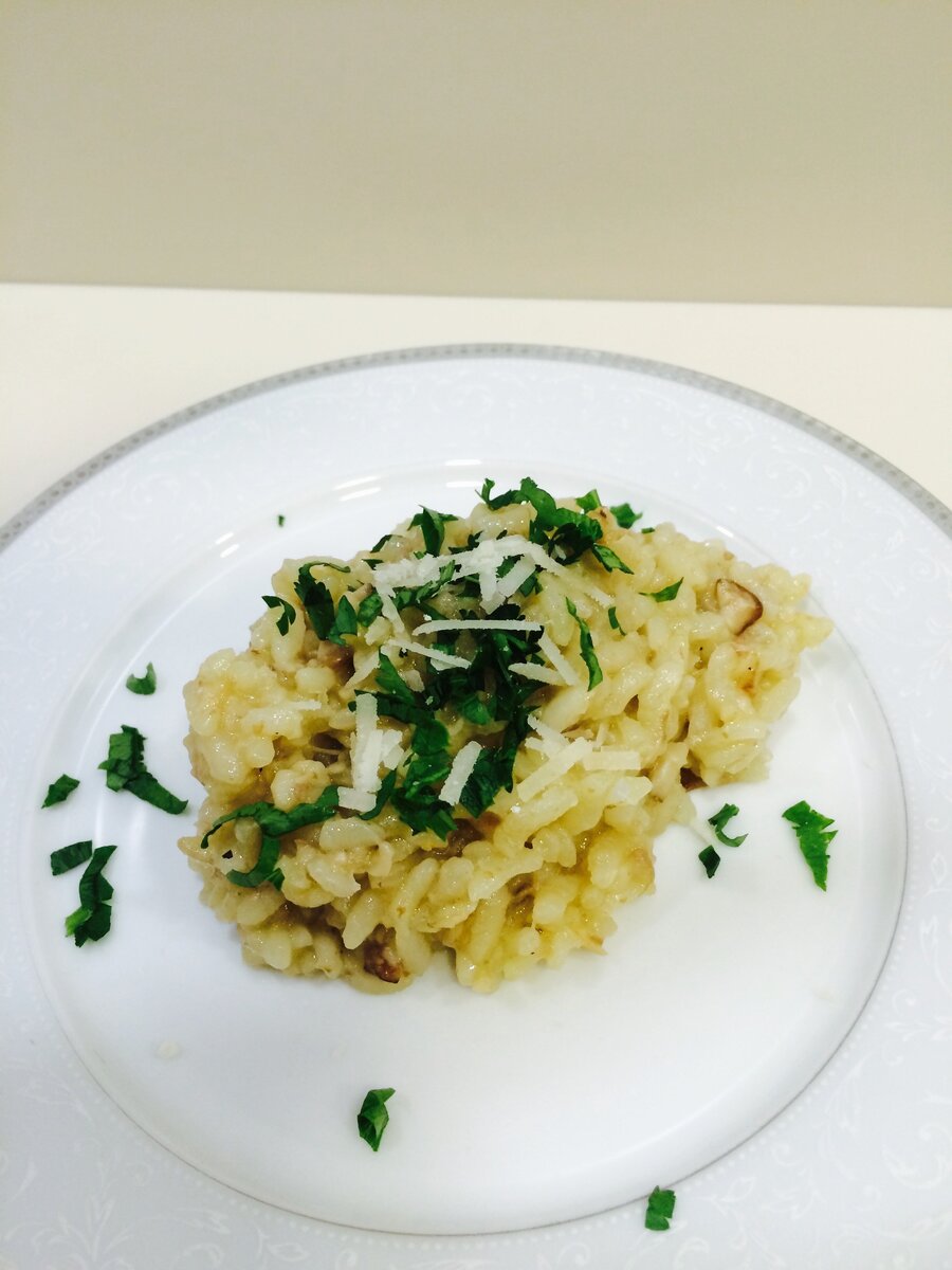 Мелко нарезать лук-шалот и чеснок, обжарить на оливковом масле до прозрачности, около 2–3 минут.Добавить рис, обжаривать еще 1 минуту, затем влить белое вино и дать ему выпариться.Залить рис горячей водой на 3/4 и, постоянно помешивая, готовить на медленном огне около 15 минут, добавляя воду по мере необходимости.Нарезать белые грибы и обжарить их на оливковом масле в течение 2 минут.В середине приготовления добавить сливочное масло, соль, перец по вкусу и шафран. Продолжать помешивать.За 3 минуты до завершения приготовления добавить обжаренные грибы и дать впитаться оставшейся влаге.Подавайте ризотто в горке на тарелке, посыпав мелко нарезанной петрушкой и тертым пармезаном, завершая подачу веточкой тимьяна.