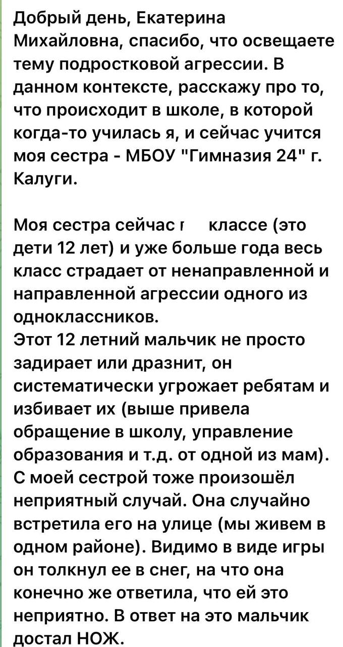 Все чаще в последнее время мне приходят обращения от школьников и их родителей из-за того, что в их классе есть хулиган, который буквально терроризирует весь класс или всю школу. Агрессивно себя ведет, дерется, нападает и избивает сверстников, срывает уроки и приносит опасные предметы на учебу. Порой доходит до того, что хулиган может кидаться стульями в педагогов и одноклассников или угрожать сверстникам. Каждую неделю около 10 таких обращений приходит из разных регионов. В них описываются ситуации, похожие на ту, о которой речь идёт в письме из Калуги выше.