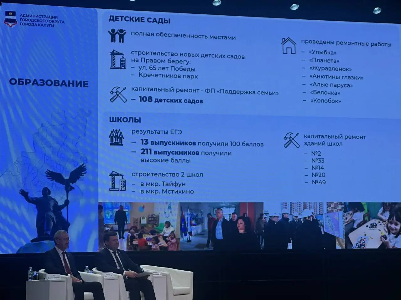 В 7 детских садах проведены ремонтные работы за счет средств местного бюджета. Это и замена оконных и дверных блоков, ремонт фасадов и кровель. Проведены капитальные ремонты зданий школ № 2 и № 33 за счет федерального и регионального и местных бюджетов. Также выполнены локальные работы за счет местного бюджета в 3 школах.