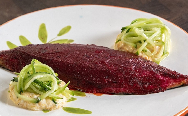 Разогрейте духовку. Противень лучше застелить фольгой или пергаментом для удобного сервирования блюда. Поместите филе скумбрии кожей вниз, а сверху равномерно распределите свекольную массу. Запекайте в течение 20–25 минут, чтобы рыба не пересохла и свекла слегка подсохла.