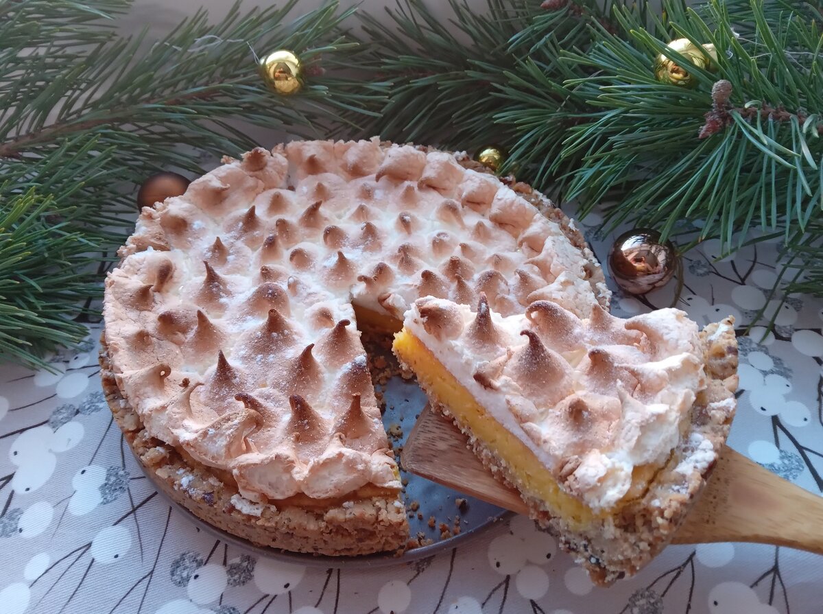 Для меренги взбейте оставшиеся белки со 150 г сахара до устойчивых пиков, затем выложите на пирог с помощью кондитерского мешка или ложки. Верните тарт в духовку при 180°C на 3 минуты для подрумянивания, после уменьшите температуру до 130°C и оставьте на 10 минут для подсушивания меренги.