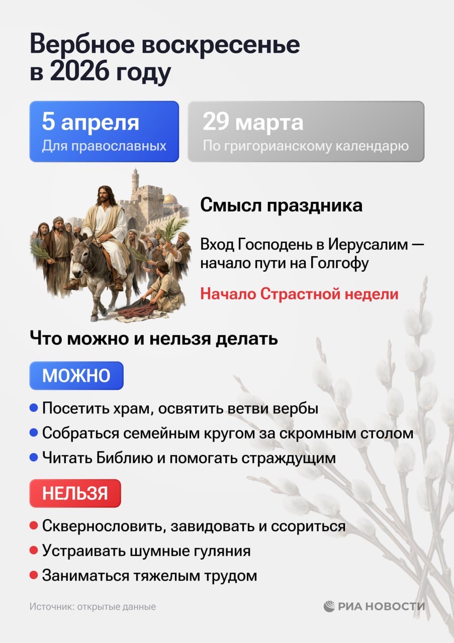Вербное воскресенье — народное название одного из двунадесятых праздников христианской церкви, известного как Вход Господень в Иерусалим. В этом году праздник отмечается сегодня, 5 апреля. Его дата зависит от празднования Пасхи и приходится на воскресный день за неделю до нее, то есть на шестое воскресенье Великого поста.
