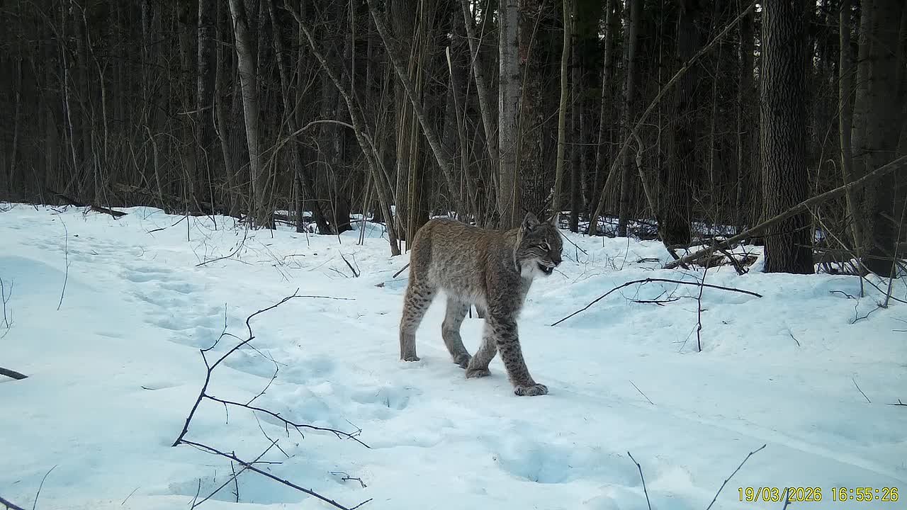 Животное запечатлела фотоловушка «Калужских засек». Как отметили сотрудники заповедника, рысь, прекрасно выглядящая после долгой снежной зимы, попала в кадр еще в марте.