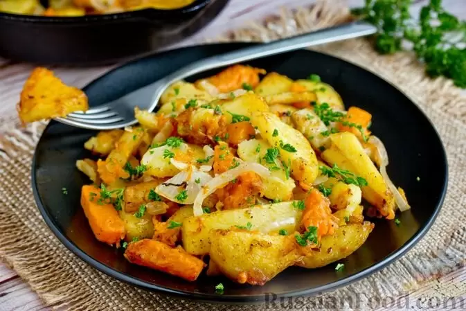 Для большего разнообразия используйте жареную картошку с тыквой и луком — привычное блюдо обретёт новый яркий вкус благодаря сладковатой тыкве.