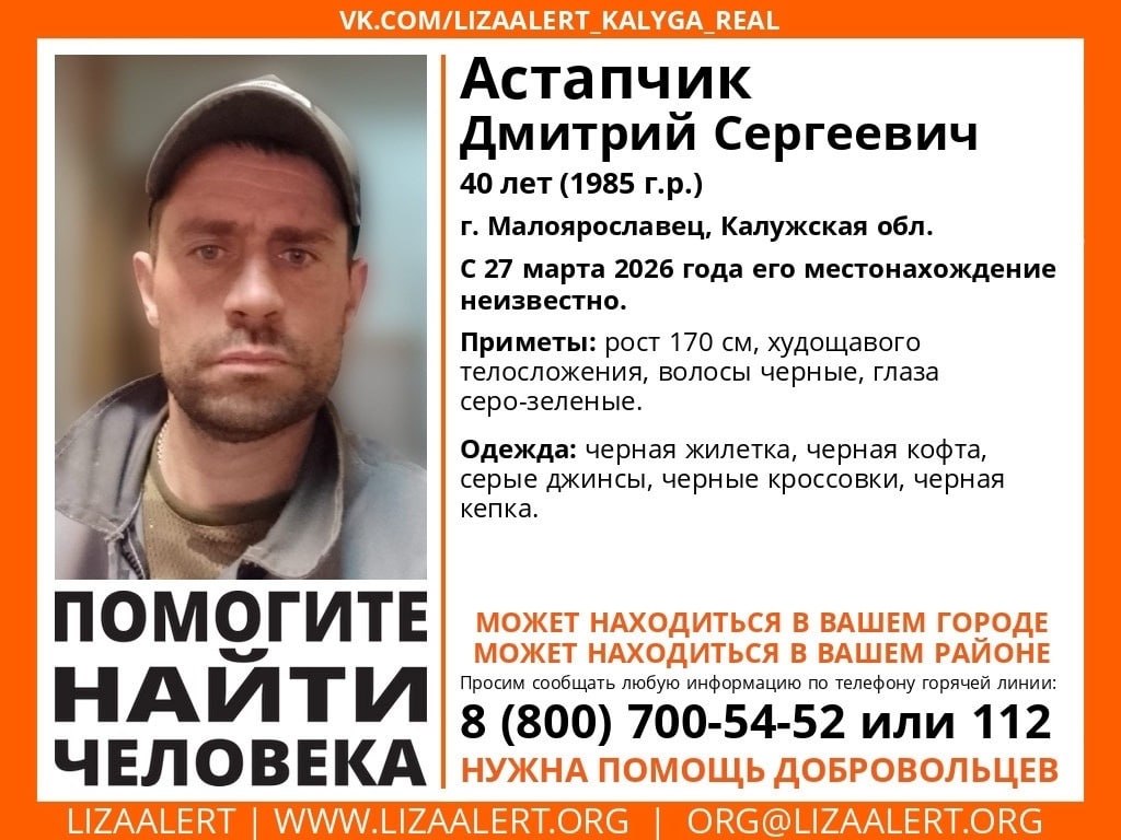 Пропал 40-летний Дмитрий Астапчик из города Малоярославец. Его поисками занимается калужский поисково-спасательный отряд «ЛизаАлерт». О местонахождении пропавшего неизвестно с 27 марта.