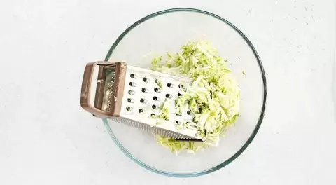 Важно поместить тертый кабачок в дуршлаг, чтобы избавить его от лишней жидкости. Оставьте на 10 минут: это поможет сохранить необходимую консистенцию теста.
