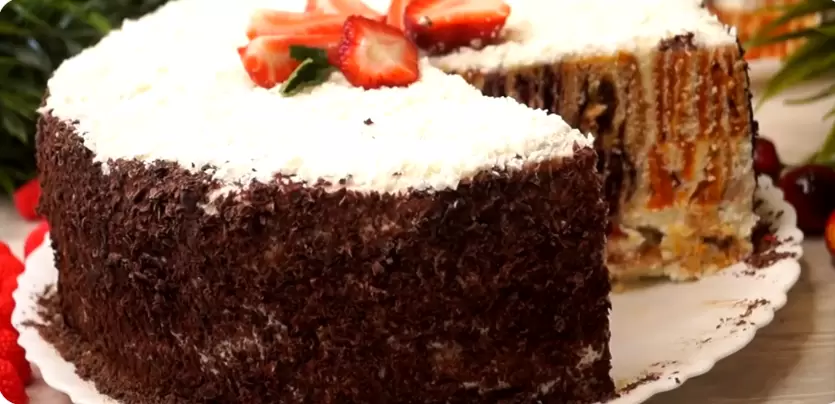 Форму застилают пленкой, на дно наливают немного крема и выкладывают рулеты срезом вверх, тщательно смазывая каждый слой кремом. Затем десерт закрывается пленкой и оставляется пропитываться на 7-8 часов перед подачей на стол. Торт можно украсить по своему усмотрению, добавив фрукты или орехи.