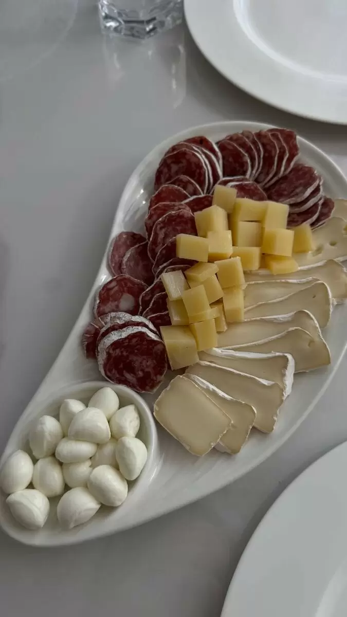 На столе также были две пиццы: грибная и томатная с мясом, испеченные на слоеном бездрожжевом тесте, что придавало им особую легкость. Не обошлось и без закусок — нарезка из сыра и колбасы дополнила трапезу, создавая идеальную симфонию вкусов.