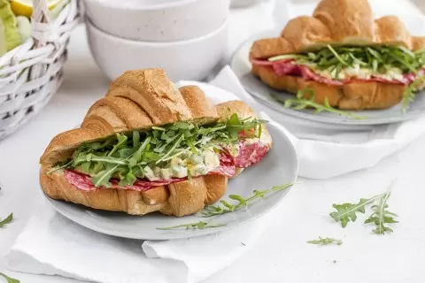 Этап 3: Теперь настало время для круассанов. Осторожно разрежьте их вдоль, не доходя до конца. На сухой сковороде подогрейте круассаны в течение минуты, затем наполните их яичным салатом, добавив немного салями и рукколы. Подавайте это аппетитное угощение немедленно, чтобы насладиться его свежестью и вкусом.