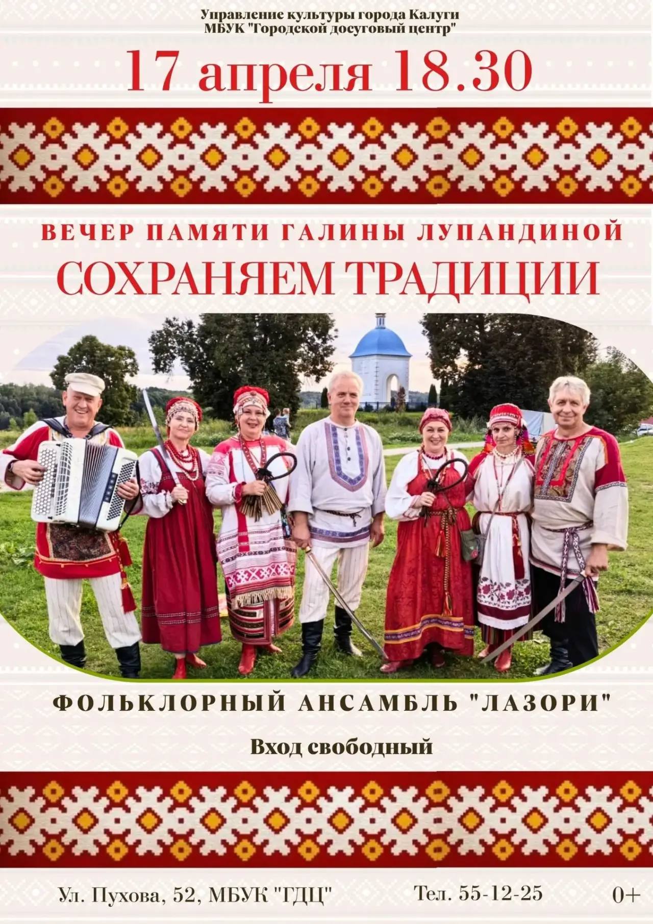 17 апреля в городском досуговом центре состоится вечер памяти Галины Лупандиной «Сохраняем традиции», которую представит фольклорный ансамбль «Лазори» с участием фольклорных коллективов Калуги.