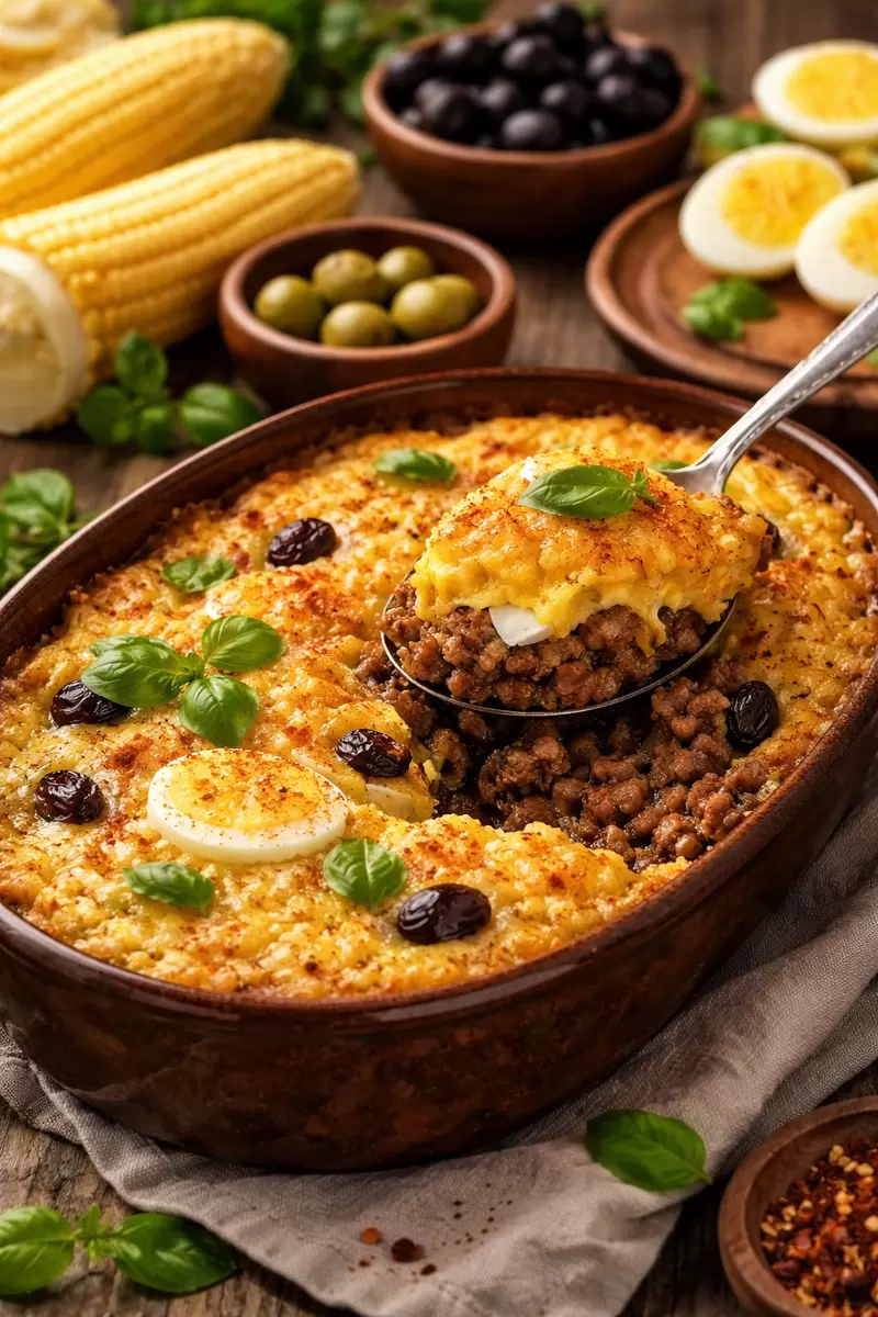 Приготовление начинается с размягчения лука и чеснока в сковороде с оливковым маслом. Затем добавляется фарш, соль, специи, изюм и маслины. Далее, для кукурузного слоя, кукурузу нужно измельчить в блендере и соединить с молоком, маслом и сахаром на среднем огне, пока не получим густую массу.