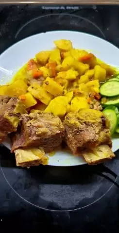 В специальной емкости раскладываются ребра и грудинка, покрытые жиром на дне. Сверху размещаются крупно нарезанные морковь и лук, затем посыпаются солью и черным перцем по вкусу. После этого в блюдо добавляют картошку, нарезанную на крупные куски, и куркуму.