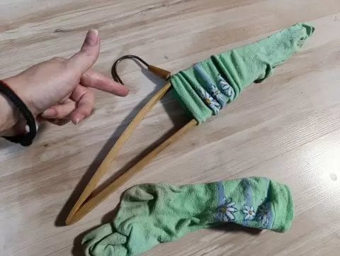 После подготовки носка он надевается на вешалку. Это простое устройство становится вашим незаменимым помощником для очистки. Просто нужно взять в руки вешалку и аккуратно провести ею под холодильником, за мебелью или в других труднодоступных местах. Удивитесь, сколько грязи и пыли удастся собрать с помощью этого нехитрого инструмента!