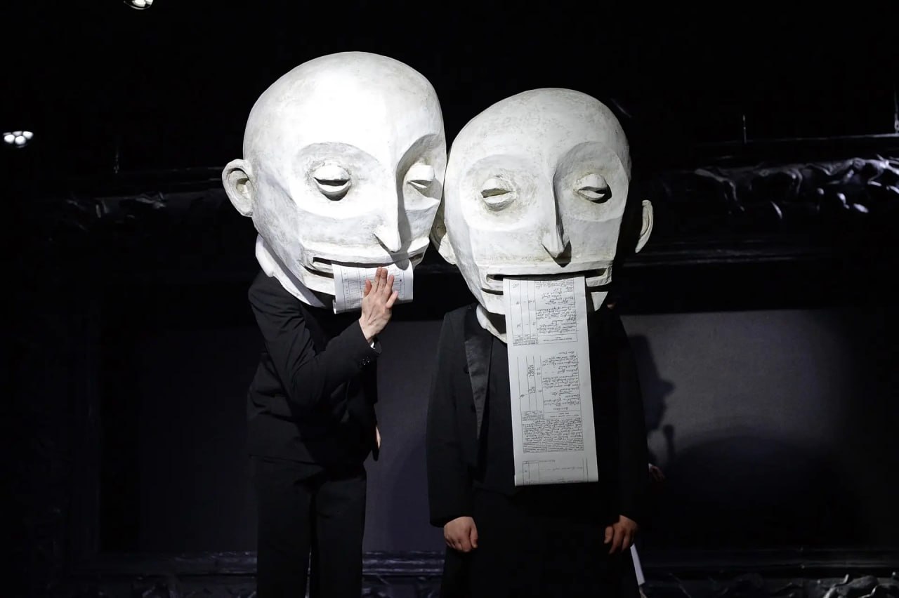 Куклы в спектакле похожи на скульптуру, персонажи костенеют, перетекают, усыхают, но всеми силами безуспешно пытаются сохранить человеческий облик.