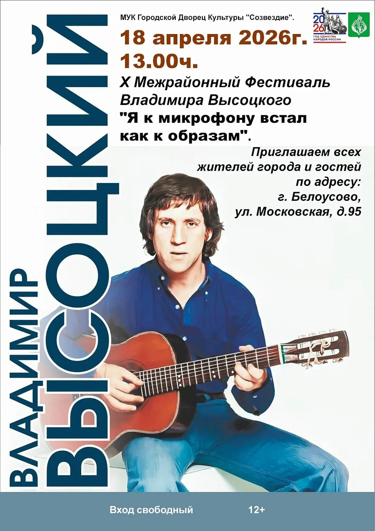 18 апреля в 13:00 в городском Дворце культуры «Созвездие» состоится X Межрайонный фестиваль Владимира Высоцкого «Я к микрофону встал, как к образам». Мероприятие призвано объединить ценителей русской бардовской песни и сохранить память о великом артисте.
