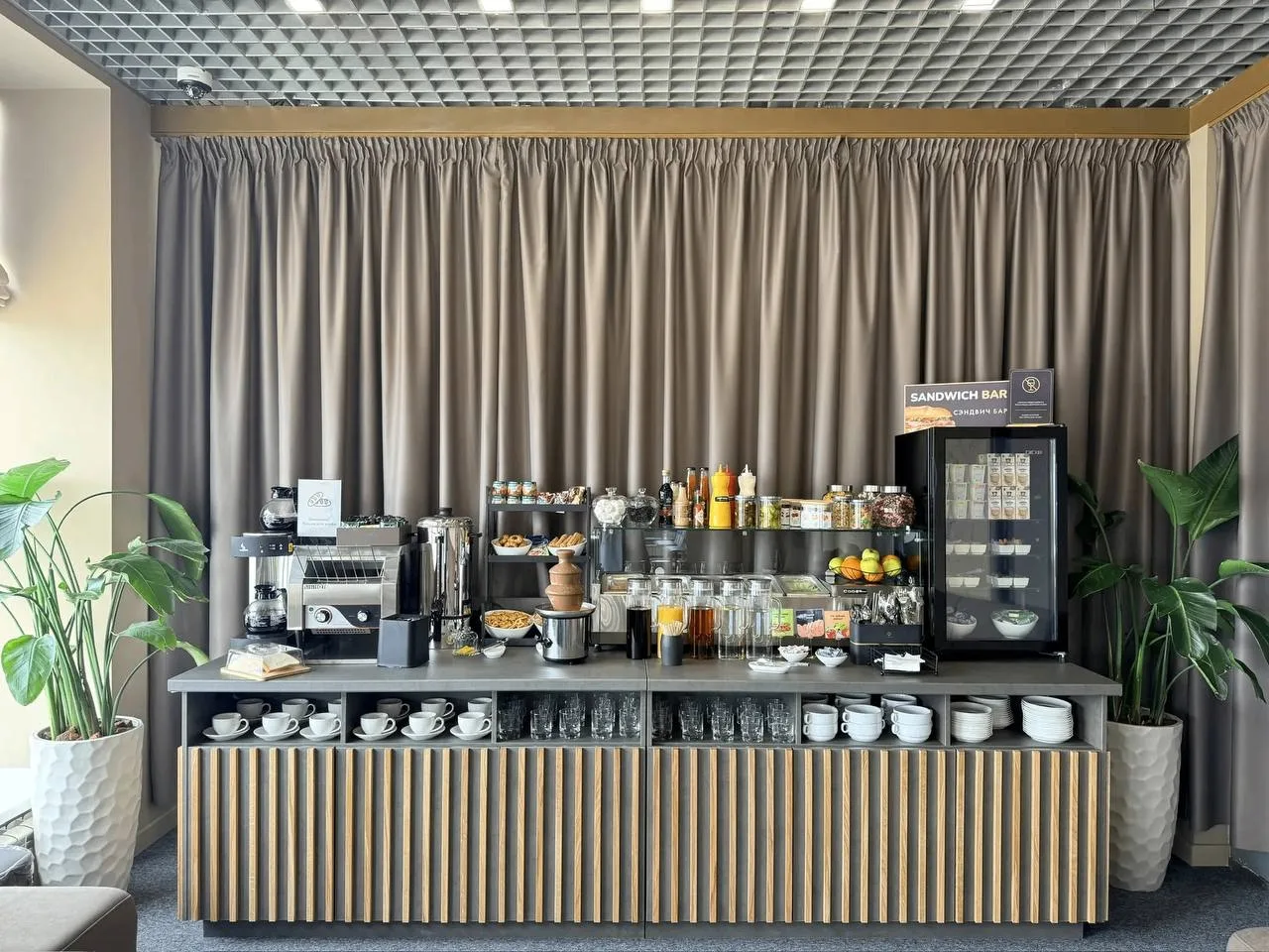 В зале есть сэндвич бар, горячие и холодные напитки, Wi-Fi, барное меню со слабоалкогольными и безалкогольными напитками, комфортные места.