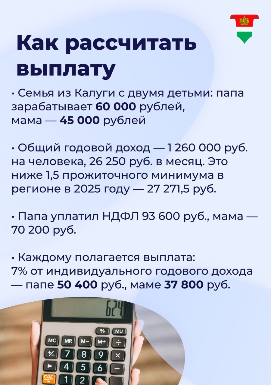 В конце прошлого года Владимир Путин анонсировал новую меру поддержки семей с двумя и более детьми. Теперь они смогут вернуть часть НДФЛ за предыдущий год. Главное условие: средний доход на члена семьи — меньше 1,5 прожиточных минимумов.
