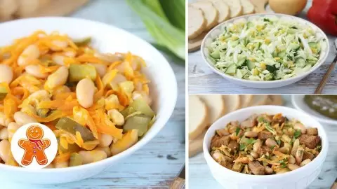 Салат 1: Мелко нарезанный лук и натертую морковь обжарьте на сковороде с растительным маслом до мягкости. Затем остудите и добавьте отцеженную фасоль и нарезанные огурцы. Приправьте по вкусу и заправьте маслом.