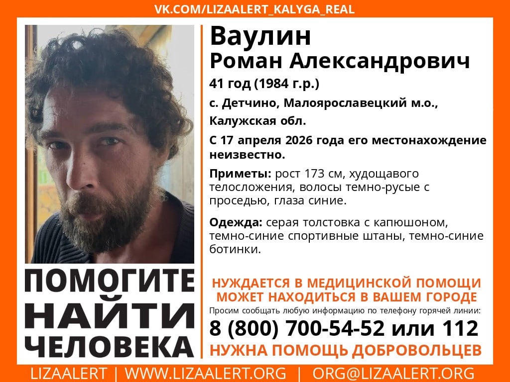 Пропал 41-летний Роман Ваулин из села Детчино Малоярославецкого округа. Поисками занимается калужский поисково-спасательный отряд «ЛизаАлерт». О местонахождении пропавшего неизвестно с 17 апреля. Сообщается, что мужчина нуждается в медицинской помощи.