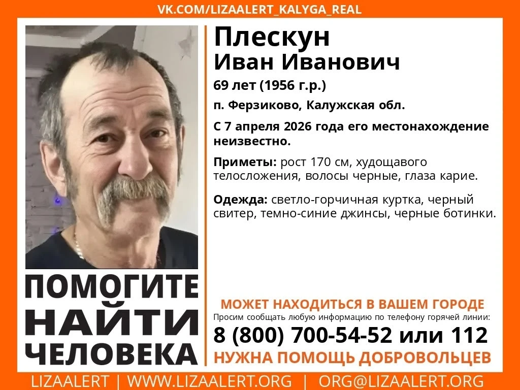Родные не видели 69-летнего Ивана Ивановича Плескуна из посёлка Ферзиково еще с 7 апреля. Приметами пропавшего поделились в отряде «ЛизаАлерт».