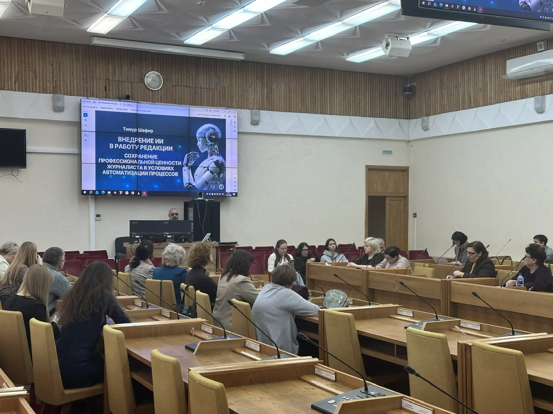 Семинар начался с обсуждения вопросов внедрения искусственного интеллекта в работу редакций и сохранения профессиональной ценности журналиста в условиях автоматизации процессов. Спикером выступил журналист-международник, секретарь СЖР Тимур Шафир.