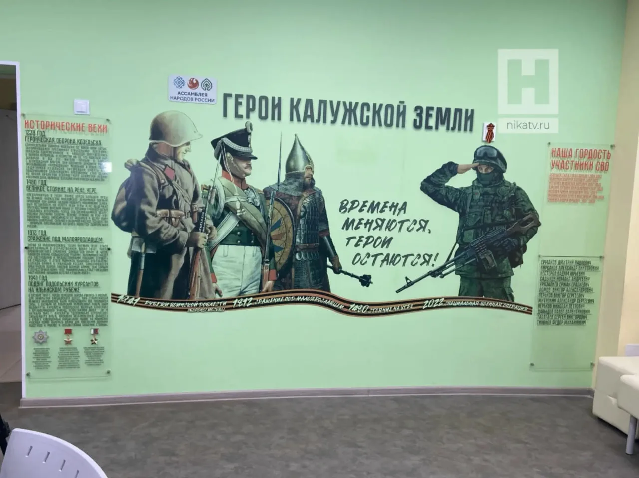 На патриотическом мурале изображена преемственность эпох: русский богатырь, воин 1812 года, солдат Красной Армии и современный боец. На табличках рядом с рисунком вписаны ключевые даты военной истории Калужской области: оборона Козельска, Великое Стояние на Угре, начало СВО и другие.