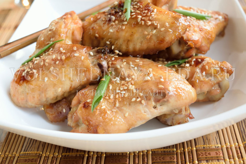 Готовые куриные крылышки можно подавать по-разному. Их можно перемешать с оставшимся маринадом или подать в отдельной соуснице. Перед подачей следует обсыпать их жареным кунжутом и украсить нарезанным зеленым луком. Этот яркий и аппетитный деликатес прекрасно сочетается с пивом и станет отличным дополнением к любой трапезе.