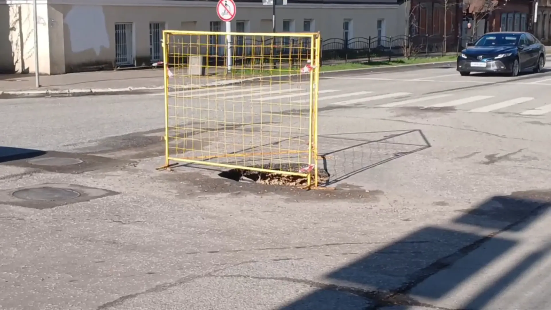 Большая яма образовалась на перекрёстке с улицей Герцена.Место провала огорожено.Однако пока нет никакой официальной информации от администрации города, когда в этом месте пройдёт ремонт.